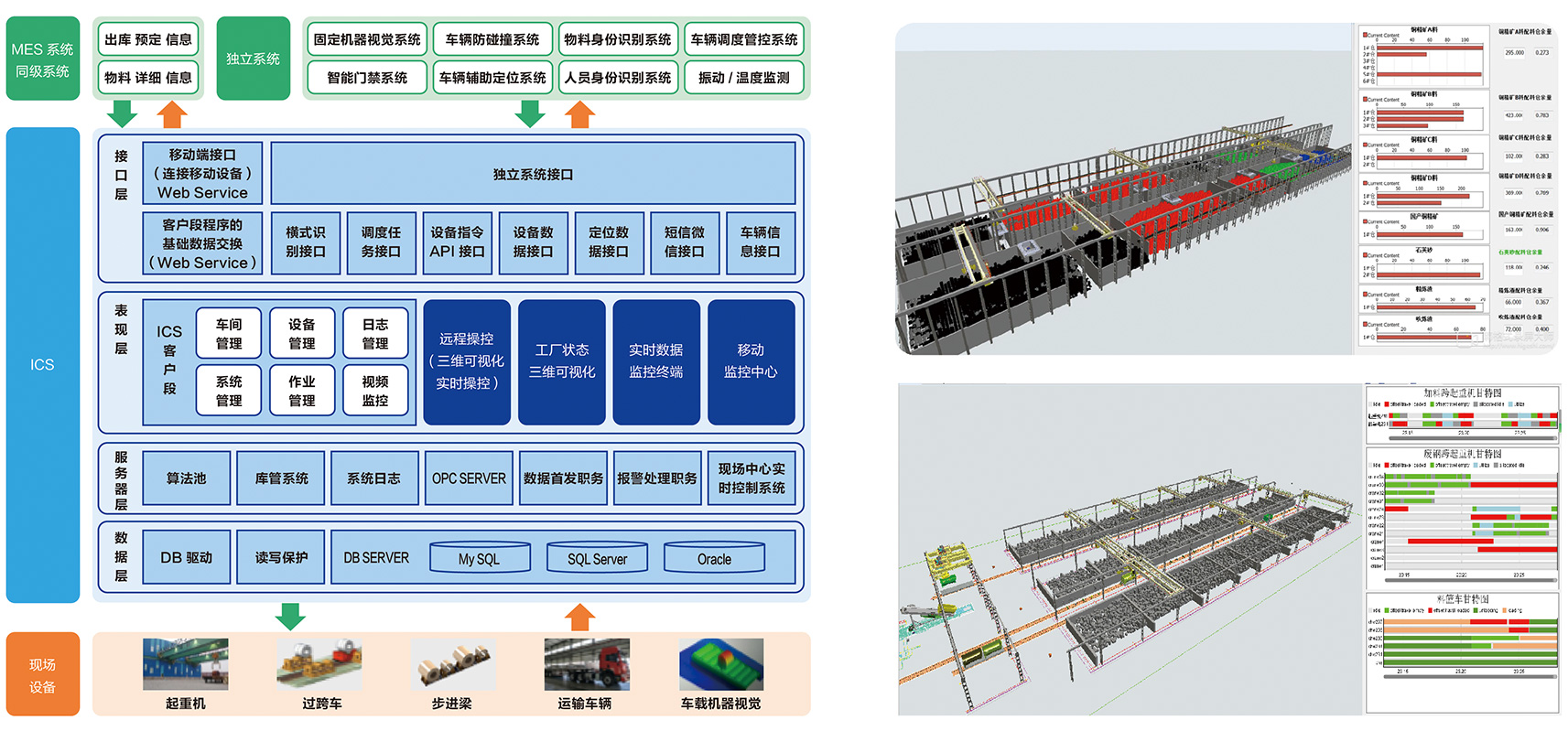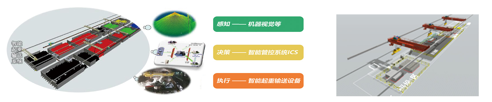 智能起重输送是包含了库区管理、调度算法、智能搬运等子系统,形成了感知、决策、执行的智能化整体解决方案。该系统在标准的生产流程、规范的操作过程的基础上,通过位置传感器、机器视觉等感知设备状态、库存状态等环境信息,经库区智能管理系统分析后自主分解生产计划,通过智能调度、路径规划等技术形成运行指令,通过自主控制、精确定位等技术由智能设备自主完成任务指令并反馈执行结果。该系统还具有远程运维、云服务及移动推送等功能,实现全生命周期管理和现场实时监控。