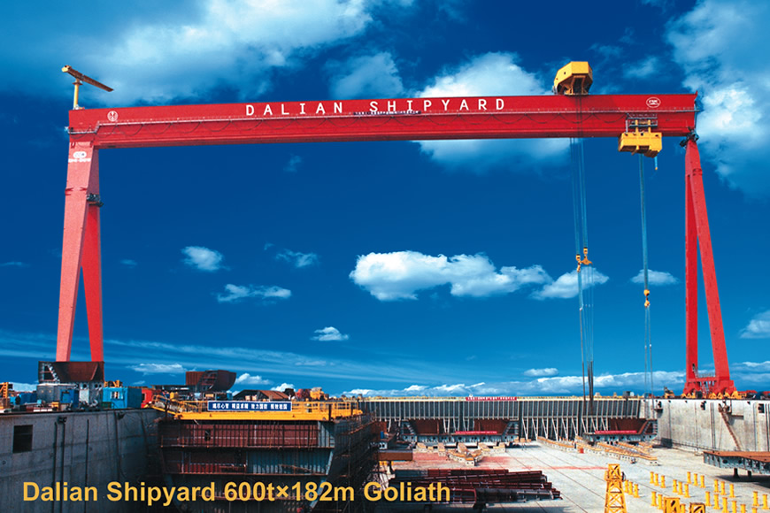 造船门式起重机是一种大起重量、大跨度,多功能、高效率的门式起重机,专用于船坞或船台进行大型船体分段、对接及翻转作业。 大连重工自1999年研制出全变频调速造船门式起重机以来,积累了丰富的机电设计、结构分析计算、制造、运输、安装和调试经验,形成了自主的核心技术,至今已研制了200—800吨等不同规格的造船门式起重机。